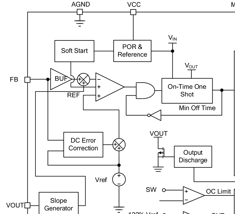 输出电压上,由于DCDC原理限制,内部存在一个参考电压Vref,也就是最低输出电压,往往在0.8到1.2V之间,有些芯片还会提供0.6V或者高达3.3V的参考电压,这个参考电压与VFB电压反馈引脚接入到一个比较器中,两者决定输出决定占空比的变化趋势。对于Buck电路,输出电压范围通常在Vref~Vin之间(往往达不到Vin)