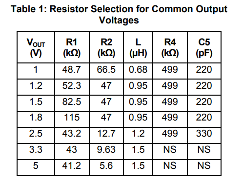 当然,这颗芯片包含了COMP引脚,用于模拟环路补偿。不过这里不着急计算,通常芯片的DataSheet会给出常用的配置参数。比如这颗芯片就给出了下面的参数